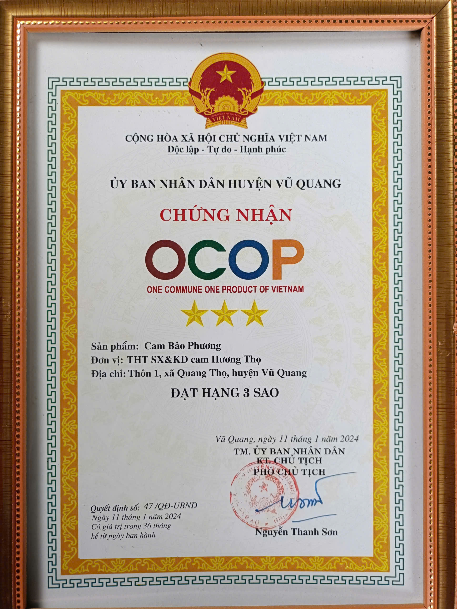 Mỗi quả cam Bảo Phương được chuyển đến tận tay khách hàng là thành quả ngọt nào mà bà con trong Tổ hợp tác đã dày công cố gắng. Và cam Bảo Phương tự hào là giống cây trồng được chọn để thực hiện mục tiêu Quốc Gia mỗi xã một sản phẩm Ocop của xã Hương Thọ.