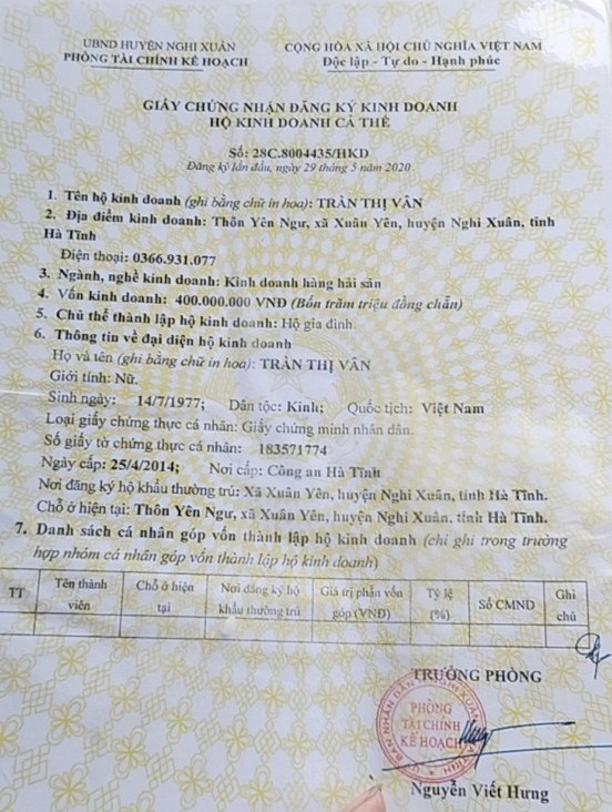 THT sản xuất và kinh doanh hải sản Vân Huy