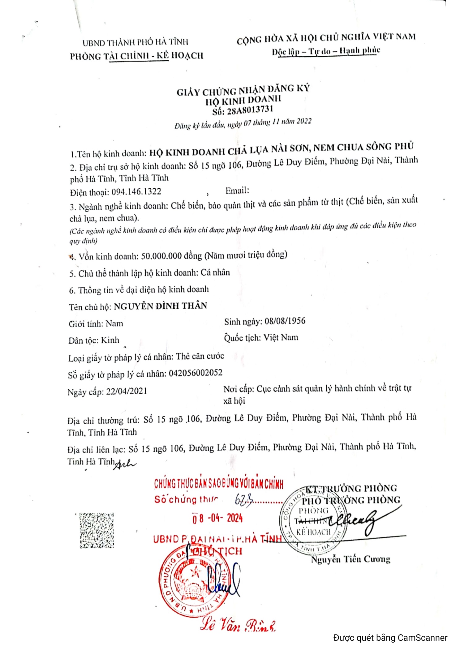 Số 15 ngõ 106 đường Lê Duy Điếm, phường Đại Nài, Tp Hà Tĩnh, tỉnh Hà Tĩnh
