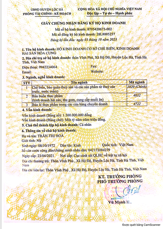 HỘ KINH DOANH, CƠ SỞ CHẾ BIẾN, KINH DOANH HẢI SẢN HÒA CUNG
