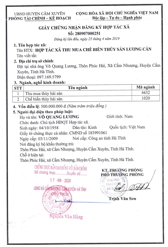 HỢP TÁC XÃ THU MUA CHẾ BIẾN THỦY SẢN LƯƠNG CẨN