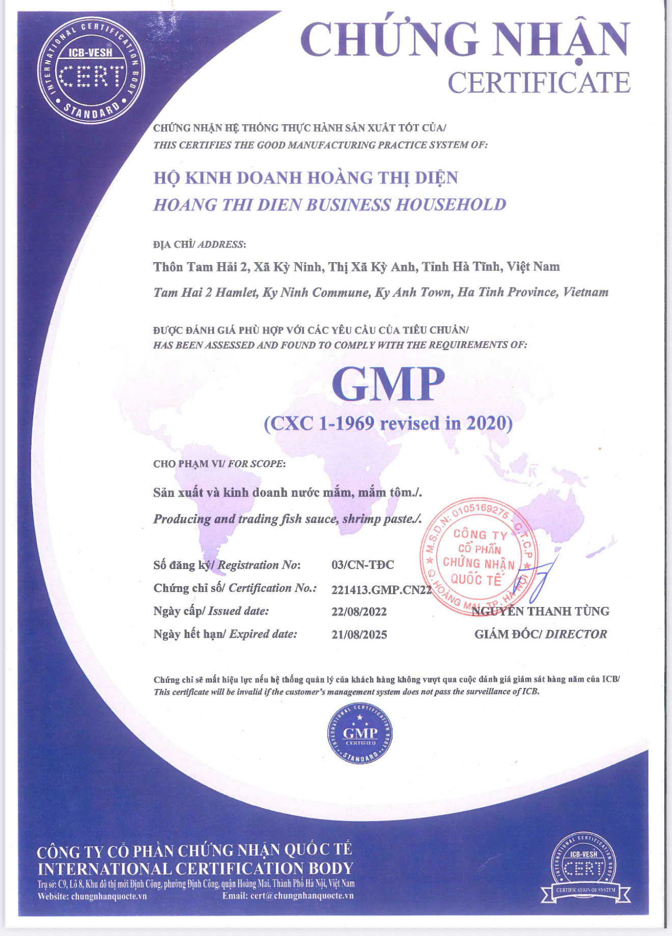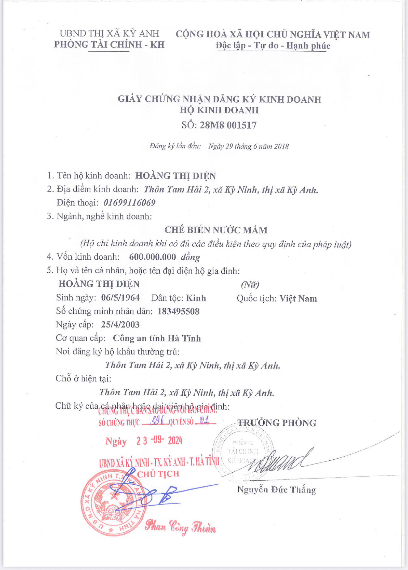 Đậm dà hương vị nước mắm truyền thống Nước măm là linh hôn của âm thực, là văn hóa tinh thần của dân tộc Việt Nam. Bởi từ chiến tranh cho đến thời bình, thậm chí lật lại từng trang sử xưa, ta vân thấy sự hiện diện dày đặc của nước mắm. Tìm đến ven biển Kỳ Ninh, Kỳ Anh, Hà Tĩnh, ta có thê cảm nhận được hương vị mặn mòi của biên quyện vào trong gió, không khỏ để tìm đến cơ sở muối nước mắm Diện Xuân nằm ở TDP Tam Hải 2, phường Kỳ Ninh. Từ đâu ngõ, mùi hương cá chín thơm địu rất đặc trưng đã đánh thức mọi giác quan từ lúc nào. Có thê nói, nghê làm nước măm là sản phâm thê hiện đậm nét côt cách, đặc trưng văn hóa của dân cư ven biên. Đó là mô hôi là nước mặt của bao thê hệ ngư dân bám biên đề đem vê những me cả cơm tươi rõi mang thương hiệu nước mắm Diện Xuân mà chẳng cần ướp đá, muối. Tình túy nhất nằm ở giai đoạn ủ chượp cả và muối. Đề chiết lọc ra những giọt nước mắm cốt chất lượng nhất. Ngoài ty lệ 3 cá: Imuối thì thời gian ù cũng không kém quan trọng. Để đạt độ sánh, mùi thơm vị đậm đà vừa vặn, màu cánh giản đẹp mắt thì khoảng thời gian 1,5 đến 2 năm được xem là lý tưởng. Để tạo ra loại nước mắm đặc biệt này, phải chọn kỹ lưỡng từng con cá, canh muối cho đúng lượng, ủ đúng ngày. Nước mắm Diện Xuân có thành phẩm trải qua hơn 12 tháng, mùa xuân năm nay cá được ngâm trong vại sành thì đến mùa xuân năm sau những giọt nước mắm sóng sánh mới được đong vào từng chai hiện diện trên mâm cơm Phải kỹ lưỡng, trong suốt thời gian ú, người làm phải khuấy cá, lọc ra những con cá khác loại thì mắm mới thom va co min dep. Mho do nuic mam Dien Xuan la san pham noi tieng ca mor ving, din don who sur yeu men của người dân, thứ đặc sản của vùng Kỳ Ninh dã di khắp các tinh thành. Đặc biệt nước mắm Diện Xuân mang đến đặc trưng 4 không: Không sử dụng hóa chất trong quá trình sản xuất, không chất bảo quản, không chất tạo mùi và không chất tạo màu. Cơ sở sản xuất nước mắm Diện Xuân nằm ngay trên điểm trung tâm, là nơi du khách đi thăm đền Chế thẳng phu nhân Nguyễn Thị Bích Châu đi qua. Cơ sở được đầu tư sạch sẽ, khang trang, những chai nước mắm được đóng gói đẹp, bắt mắt. Chúng tôi cam kết sẽ tạo ra một sản phẩm chuẩn của nước mắm Diện Xuân đề từ đó phát triển kinh tế đồng thời thúc đầv phát triên du lích khu vưc.