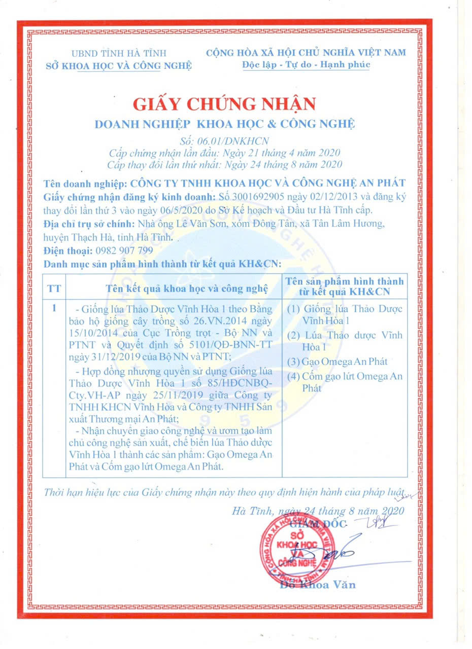 Năm 2019, để “nuôi” thương hiệu “Omega An Phát” trưởng thành, Công ty An Phát mua bản quyền giống lúa thảo dược Vĩnh Hòa 1 (do Công ty Công ty TNHH Khoa học và Công nghệ Vĩnh Hòa, tỉnh Nghệ An chọn tạo) để về sản xuất trên địa bàn Hà Tĩnh. Đến cuối năm 2022, đơn vị tiếp tục liên kết với nông dân thị xã Hồng Lĩnh (Hà Tĩnh) xây dựng mô hình sản xuất gạo hữu cơ ST25 trên ruộng rươi.