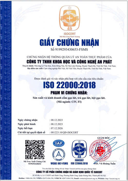 Nhận được sự ủng hộ của các cấp chính quyền địa phương, trên diện tích gần 7.000m2 đất tại Cụm công nghiệp Phù Việt (xã Việt Tiến, huyện Thạch Hà), anh An đầu tư hệ thống nhà xưởng kiên cố, với dây chuyền thiết bị chế biến và đóng gói sản phẩm gạo, cốm, bột dinh dưỡng theo công nghệ cao mang thương hiệu “Omega An Phát”.