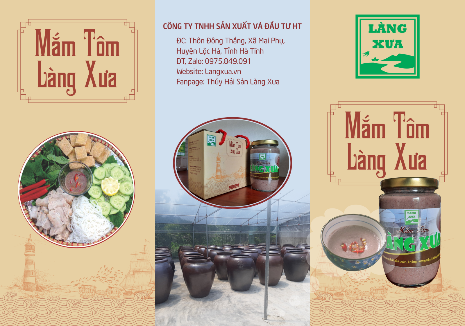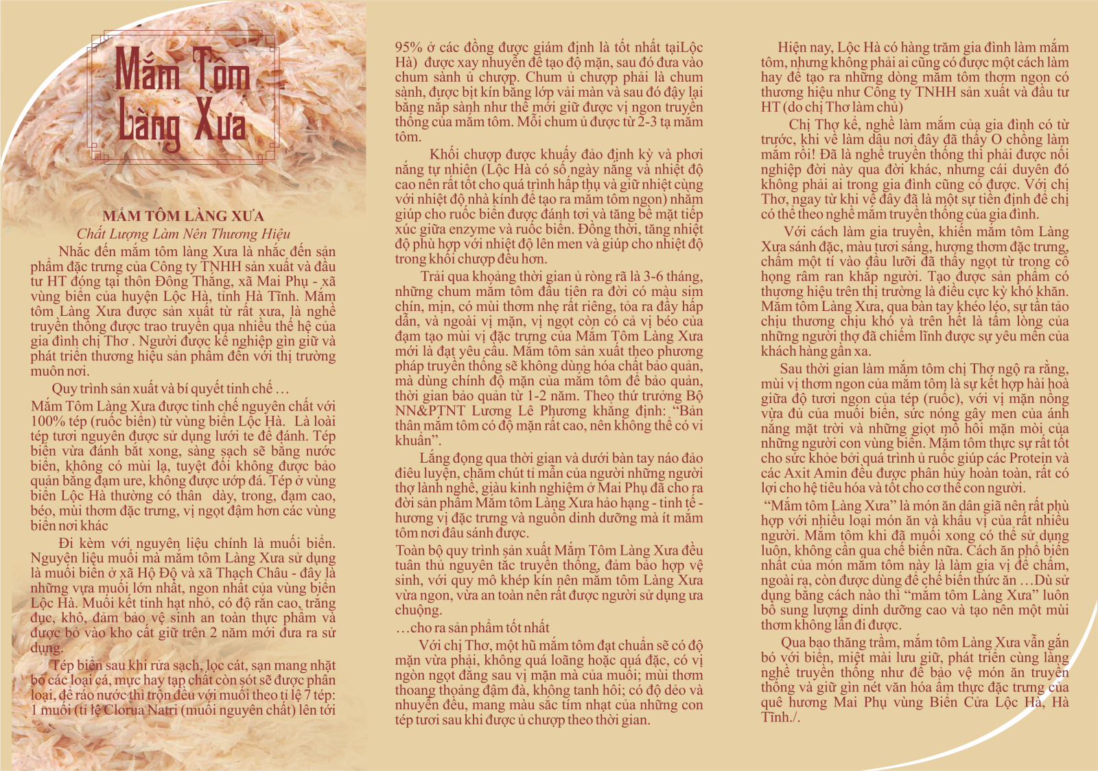 Nhắc đến mắm tôm làng Xưa là nhắc đến sản phẩm đặc trưng của Công ty TNHH sản xuất và đầu tư HT đóng tại thôn Đông Thắng, xã Mai Phụ - xã vùng biển của huyện Lộc Hà, tỉnh Hà Tĩnh. Mắm tôm Làng Xưa được sản xuất từ rất xưa, là nghề truyền thống được trao truyền qua nhiều thế hệ của gia đình chị …..Thơ - người được kế nghiệp gìn giữ và phát triển thương hiệu sản phẩm đến với thị trường muôn nơi.