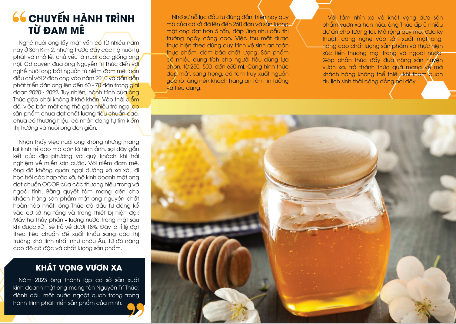 Nhận thấy việc nuôi ong không những mang lại kinh tế cao mà còn là hình ảnh, sợi dây gắn kết của địa phương và quý khách khi trải nghiệm về miền sơn cước. Với niềm đam mê, ông đã không quản ngại đường xá xa xôi, đi học hỏi các hợp tác xã, hộ kinh doanh mật ong đạt chuẩn OCOP của các thương hiệu trong và ngoài tỉnh. Bằng quyết tâm mang đến cho khách hàng sản phẩm mật ong nguyên chất hoàn hảo nhất, ông Thức đã đầu tư đáng kể vào cơ sở hạ tầng và trang thiết bị hiện đại: Máy hạ thủy phần - lượng nước trong mật sau khi được xử lí sẽ trở về dưới 18%. Đây là tỉ lệ đạt theo tiêu chuẩn để xuất khẩu sang các thị trường khó tính nhất như châu Âu, từ đó nâng cao độ cô đặc và chất lượng sản phẩm.