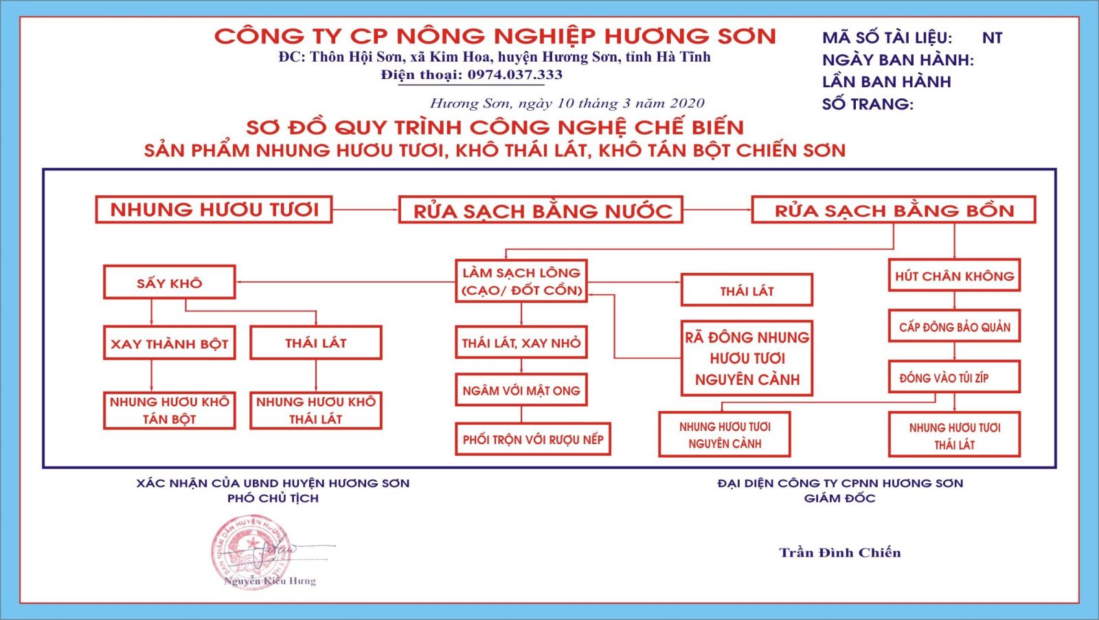 Công ty Cổ phần Nông nghiệp Hương Sơn thành lập ngày 2/2/2018, ngành nghề kinh doanh chính là Nhung Hươu. Với mong muốn đưa sản phẩm nhung hươu khu vực Hương Sơn đến với đông đảo người tiêu dùng, tạo điều kiện thuận lợi trong phát triển nghề chăn nuôi hươu sao ở Hương Sơn, Công ty Cổ phần Nông nghiệp Hương Sơn với thương hiệu “Nhung hươu Chiến Sơn” đã được ra đời. Ban đầu công ty bao tiêu sản phẩm nhung hươu tươi cho bà con nhân dân. Sau đó, nhờ tiếp xúc với kỹ thuật, công nghệ hiện đại, công ty đã chuyển sang đầu tư máy móc, thiết bị sơ chế hiện đại để làm ra các sản phẩm hữu ích, thuận lợi trong sử dụng gồm: Nhung hươu tươi nguyên cặp, Nhung tươi thái lát, Nhung ngâm mật ong, Nhung Hươu khô tán bột, Rượu Nhung Hươu, Cao Nhung Hươu,… Sản phẩm của Nhung hươu Chiến Sơn đều được bảo hộ về thương hiệu do Bộ Khoa học và Công nghệ cấp số: B041704 ngày 24/9/2019, sản phẩm được bảo hộ chỉ dẫn địa lý số: 03/GCN/UBND ngày 19/03/2019. Nhung Hươu Chiến Sơn – Chất lượng làm nên thương hiệu